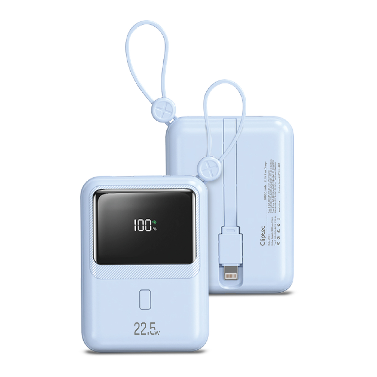 CLiPtec M-series MPB231 10000mAh 22.5W+PD20W Fast Charging Power bank with built-in Lightning and Type-C cable is a fast-charging with 4 outputs – USB-A, Type C , Type-C cable and Lightning cable technology allows you to charge your smartphone and tablet. The compact and durable design makes it convenient to charge your devices while on the go.