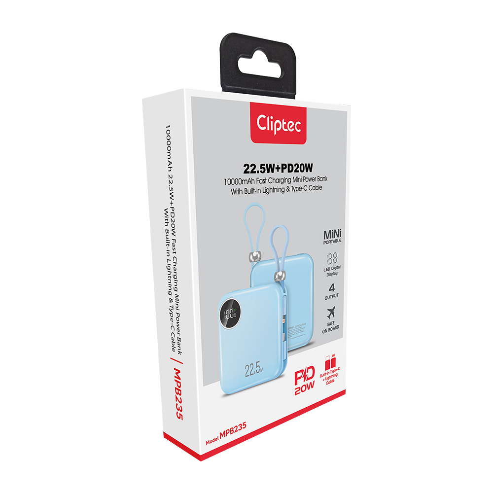CLiPtec M-series MPB235 10000mAh 22.5W+PD20W Fast Charging Power bank with built-in Lightning and Type-C cable is a fast-charging with 4 outputs - USB-A, Type C , Type-C cable and Lightning cable technology allows you to charge your smartphone and tablet. The compact and durable design makes it convenient to charge your devices while on the go. You’ll now have more power, more freedom in the traveling road and more convenience than ever before to keep your device powered and charged. MPB235 is a high compact grade A 10000mAh lithium Polymer battery, which can prevent over charge and discharge, short circuit, over current and other abnormal conditions, bring more safety.