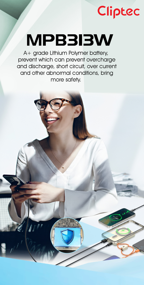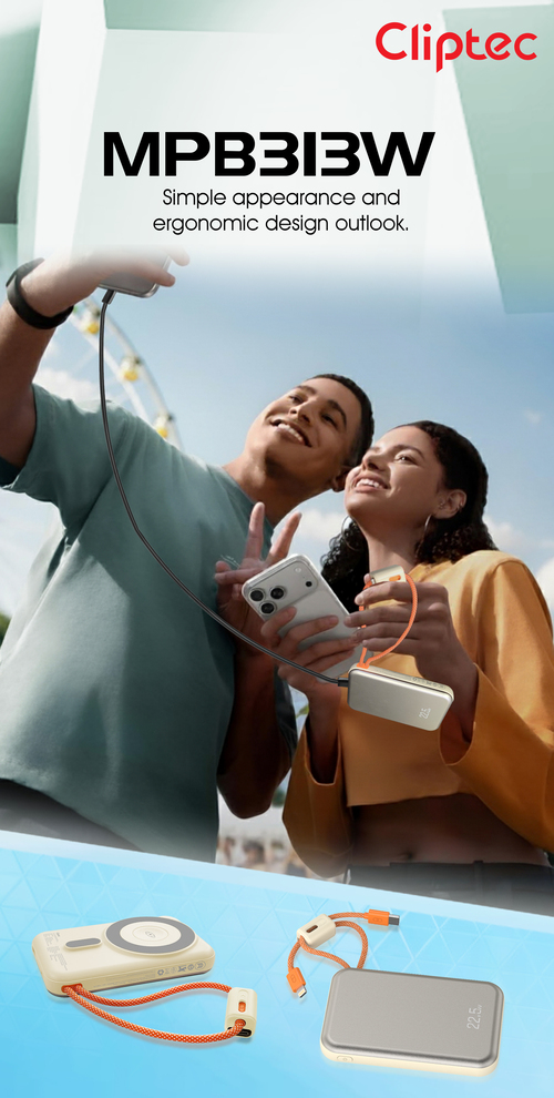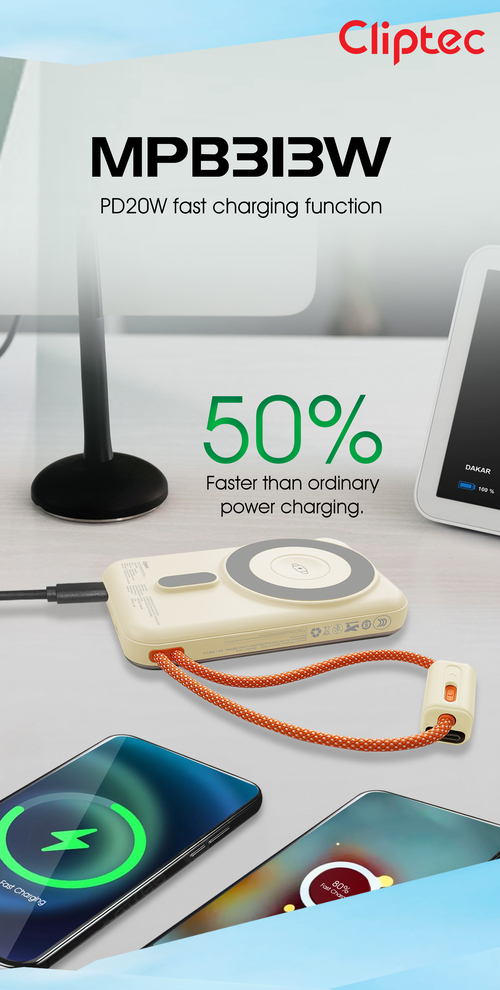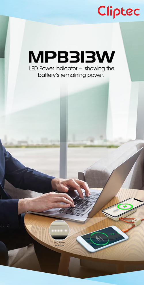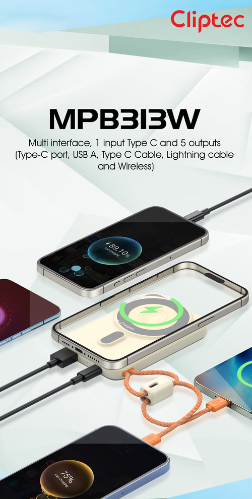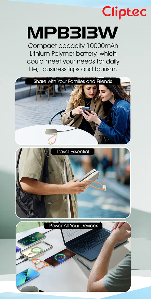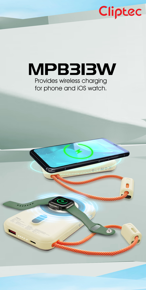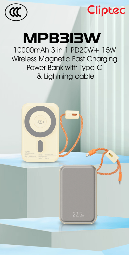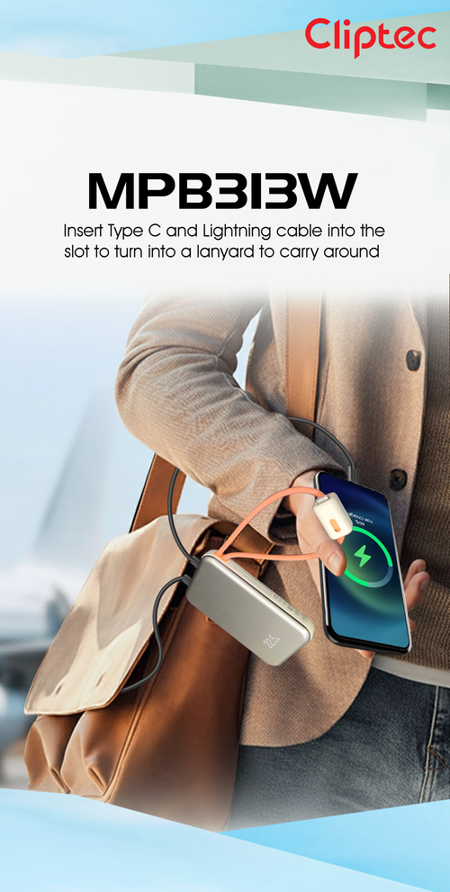 CLiPtec M-series MPB313W 10000mAh 3 in1 PD20W+15W Wireless Fast Charging Power bank with Type C and Lightning cable is an ultimate feature with 4 outputs Type C port, Type C cable, USB A output and 15W wireless output. This power bank packs a powerful 10000mAh capacity into a remarkably compact and lightweight design. Measuring just 110 x 70.3x 17.6mm and weighing only 217g, it's the perfect portable charger to take anywhere and easily fit in your pocket, wallet or handbag, making it convenient to carry and charge your mobile devices.