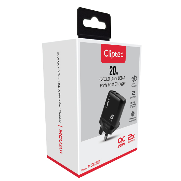 CLiPtec M-series MCU281 20W QC3.0 Dual USB A Ports Fast Charger allows you to fast charge your smartphone and tablet. The compact and durable design makes it convenient to charge your battery while on the go. You’ll now have more power, more freedom in the traveling road and more convenience than ever before to keep your device powered and charged.