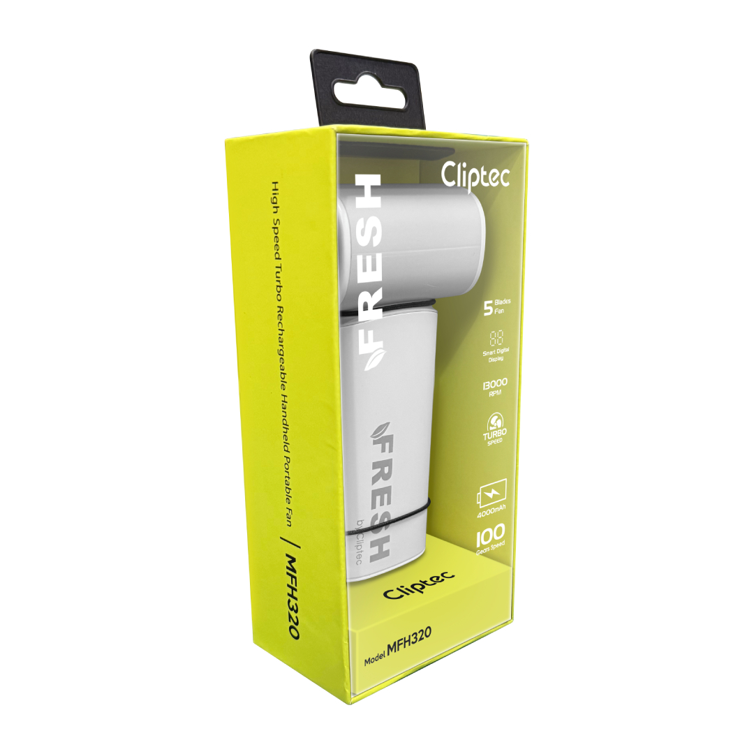 The M-Series MFH320 High speed Turbo rechargeable portable fan is the portable fan features a 5 fan bleads and brushless motor that provides superior power and durability, greatly enhancing the product's lifespan. Powerful brushless motor with a speed of up to 13,000 RPM. This portable cooling fan can release even more powerful wind power. Equipped with a 4000mAh battery, this portable fan supports 5V/2A charging, taking only 2 hours to fully charge, and providing up to 10 hours of usage time. When used at the highest speed 100, the operating time is approximately 2 hours, while at the lowest speed 1, the operating time extends to about 13 hours. The MFH320 portable fan can be charged using a USB interface, laptop, mobile power bank, or charger, making it ideal for on-the-go charging.
