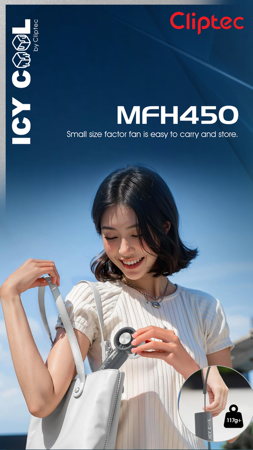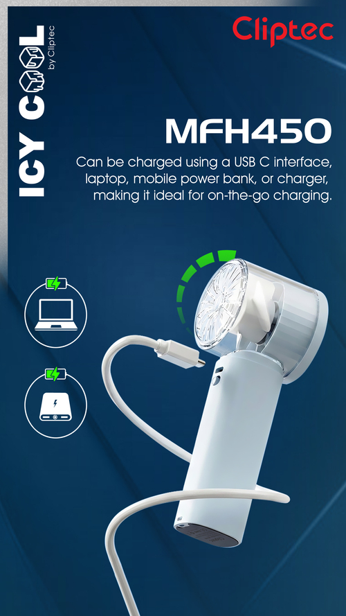 The  Icy Cool Series MFH450 High speed Turbo rechargeable icy cooling portable fan is the portable fan features a 4 fan bleads and brushless motor that provides superior power and durability, greatly enhancing the product's lifespan. Powerful brushless motor with a speed of up to 12000 RPM. This portable cooling fan can release even more powerful wind power.