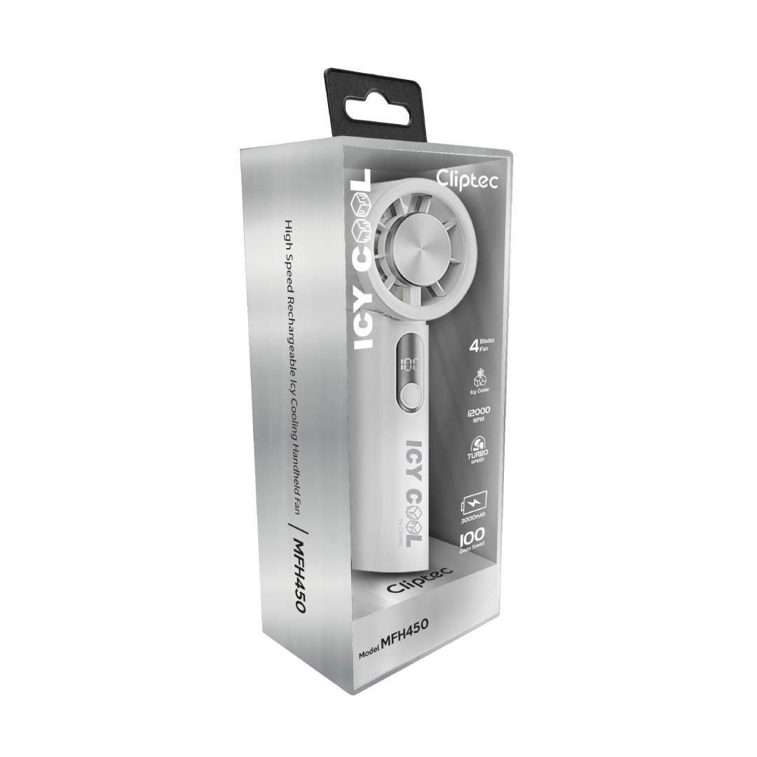 The Icy Cool Series MFH450 High speed Turbo rechargeable icy cooling portable fan is the portable fan features a 4 fan bleads and brushless motor that provides superior power and durability, greatly enhancing the product's lifespan. Powerful brushless motor with a speed of up to 12000 RPM. This portable cooling fan can release even more powerful wind power.