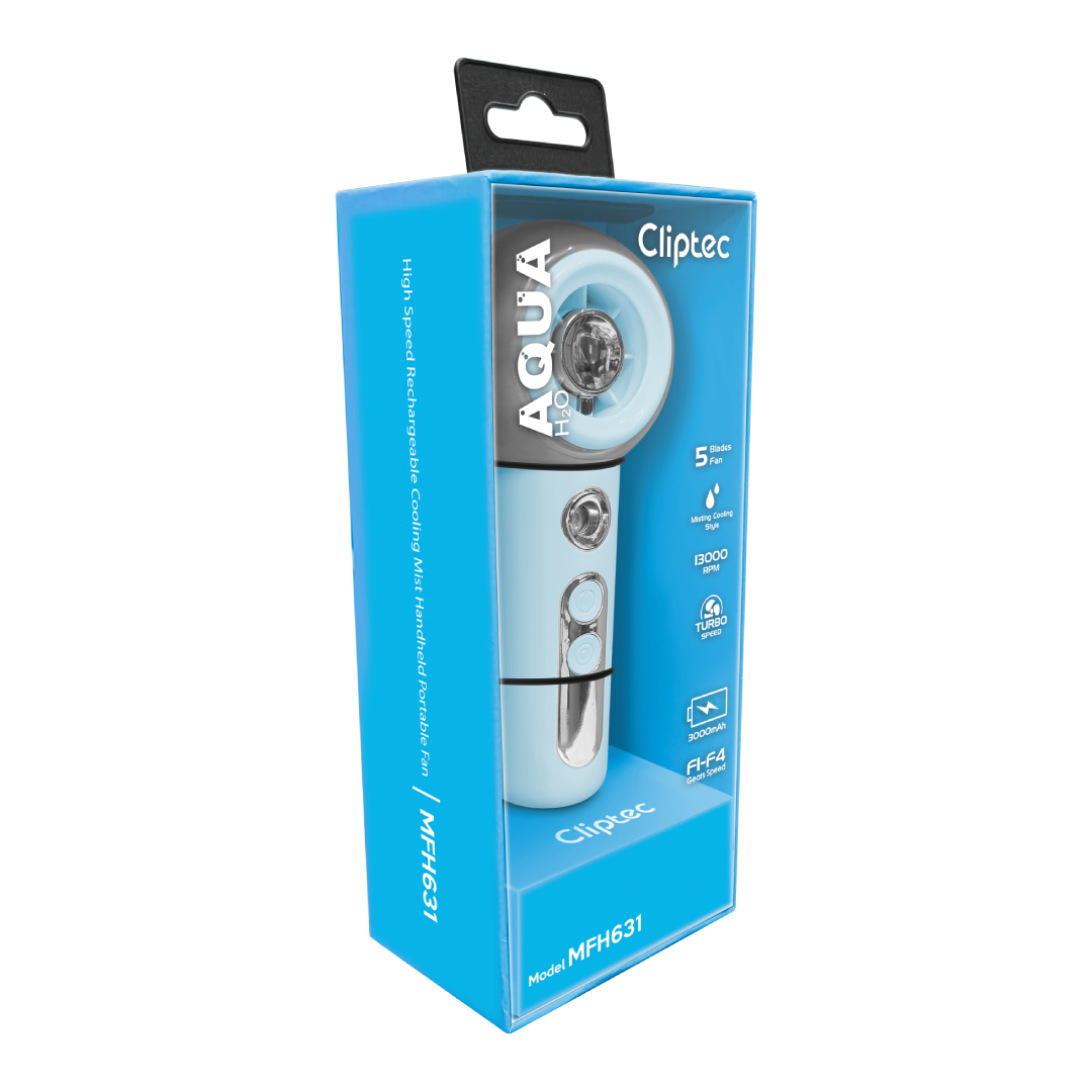 CLIPTEC MFH631 HIGH SPEED RECHARGEABLE COOLING MIST HANDHELD PORTABLE FAN - BLUE