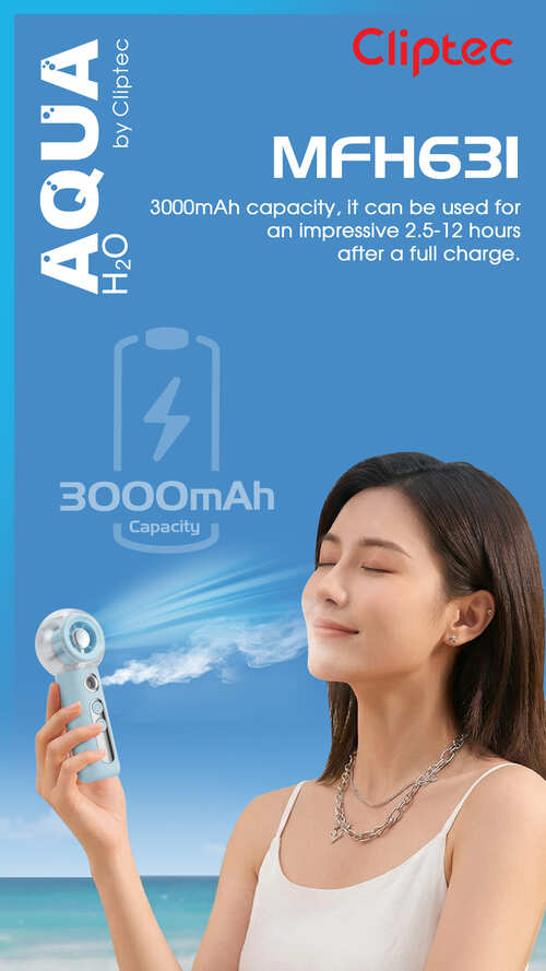 Equipped with a 3000mAh battery, this portable fan supports 5V/1A charging, taking only 3-4 hours to fully charge, and providing up to 13 hours of usage time. When used at the highest speed 100, the operating time is approximately 2.5 hours, while at the lowest speed 1, the operating time extends to about 12 hours. The MFH630 portable fan can be charged using a USB interface, laptop, mobile power bank, or charger, making it ideal for on-the-go charging.