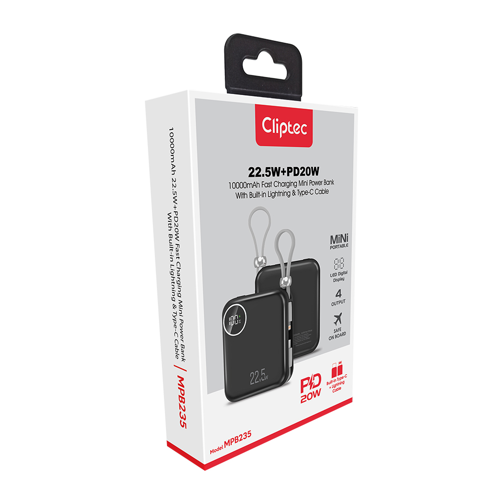 CLiPtec M-series MPB235 10000mAh 22.5W+PD20W Fast Charging Power bank with built-in Lightning and Type-C cable is a fast-charging with 4 outputs - USB-A, Type C , Type-C cable and Lightning cable technology allows you to charge your smartphone and tablet. The compact and durable design makes it convenient to charge your devices while on the go. You’ll now have more power, more freedom in the traveling road and more convenience than ever before to keep your device powered and charged. MPB235 is a high compact grade A 10000mAh lithium Polymer battery, which can prevent over charge and discharge, short circuit, over current and other abnormal conditions, bring more safety.
