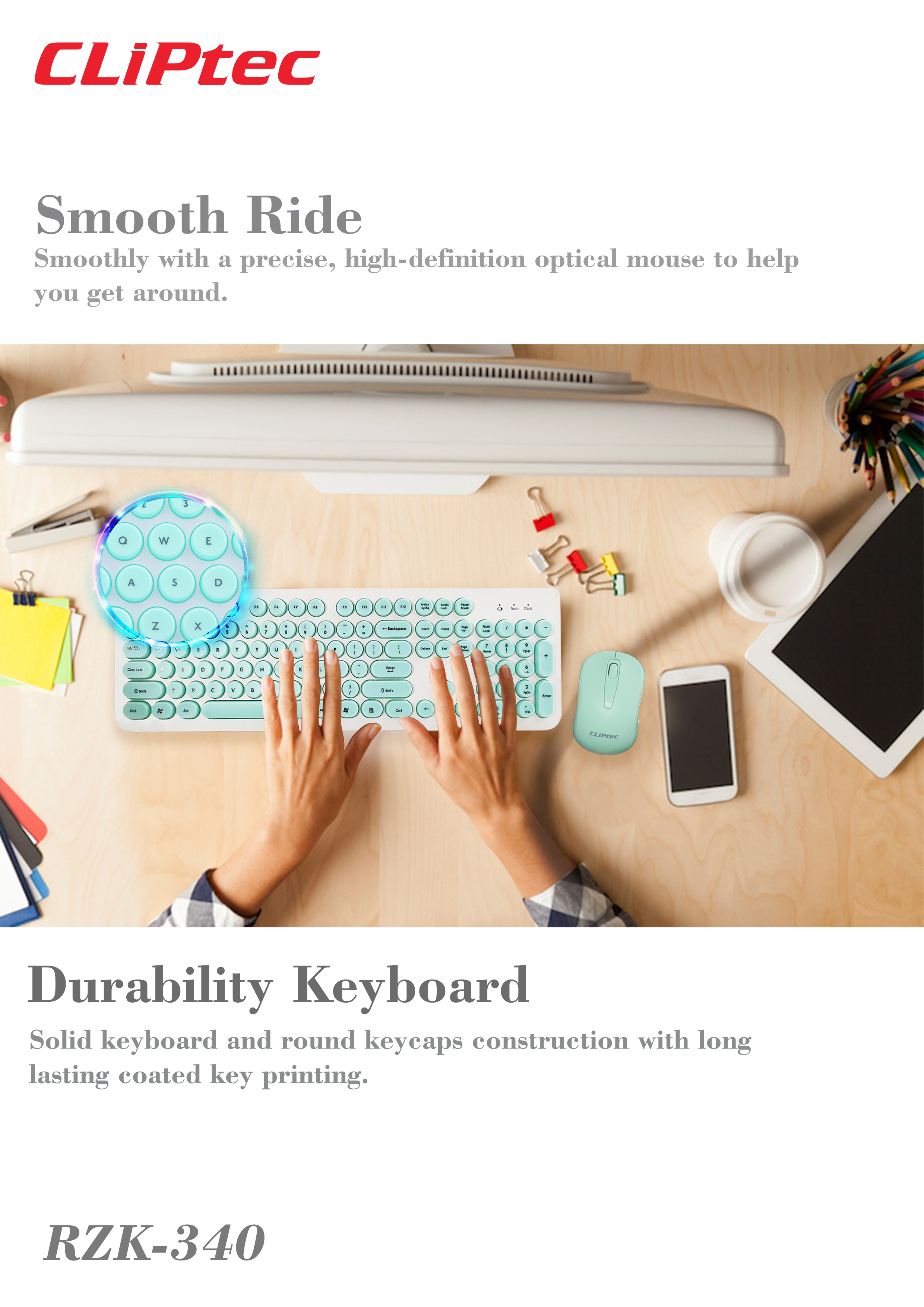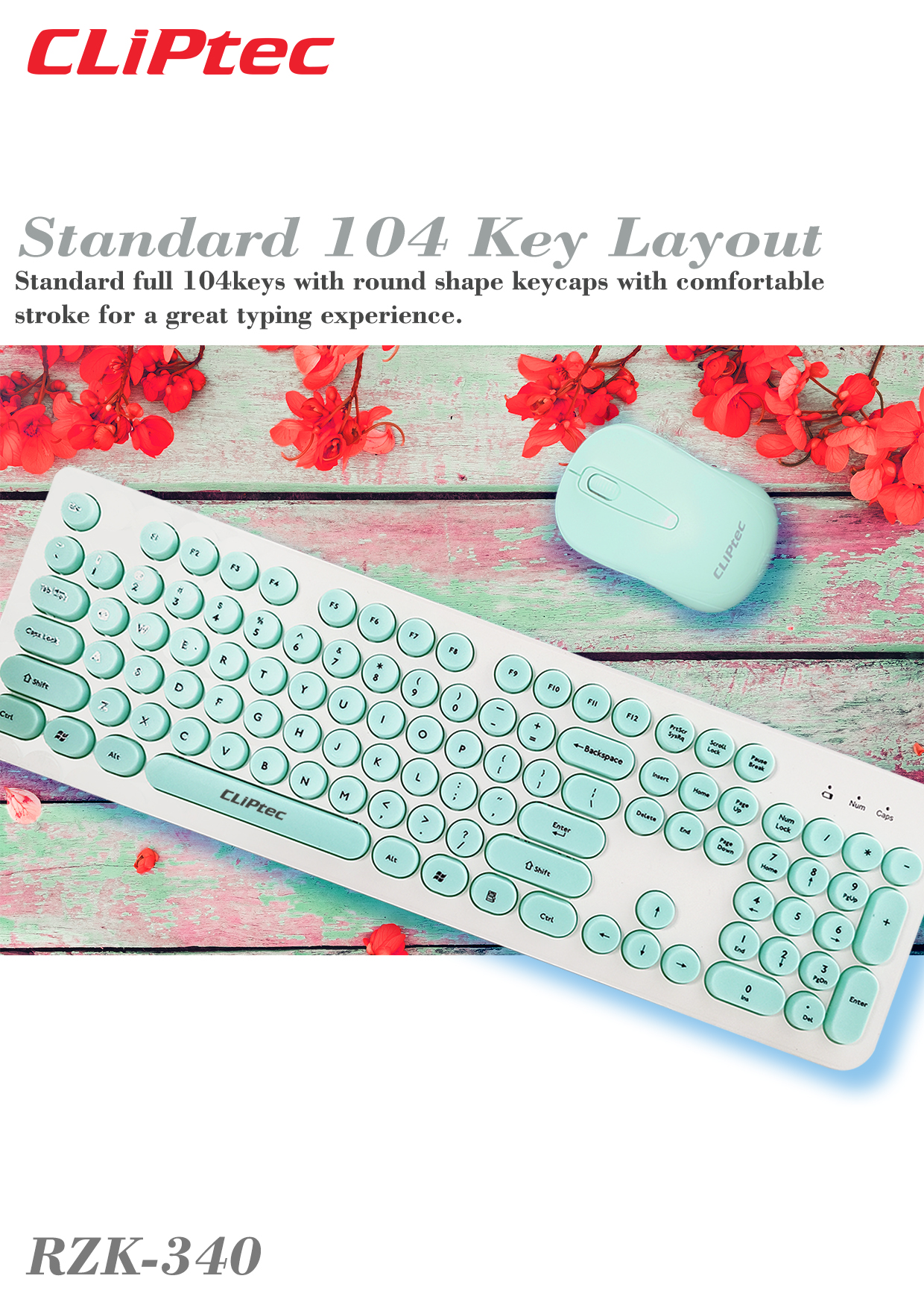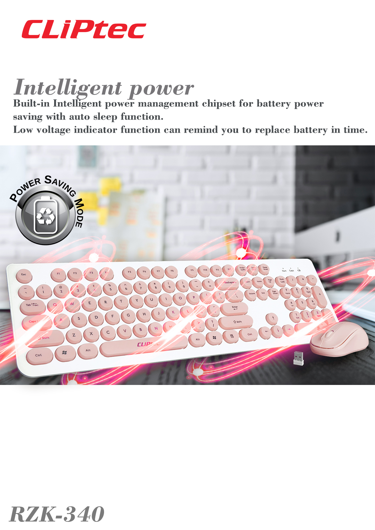 This keyboard provides low profile round shape keycaps with comfortable stroke for a great typing experience and extremely comfortable and contains a 19mm Key pitch. Solid keyboard and keycap construction with long lasting coated key printing. The full size profile wireless mouse with 1200DPI optical that provide great working efficiency and performance.