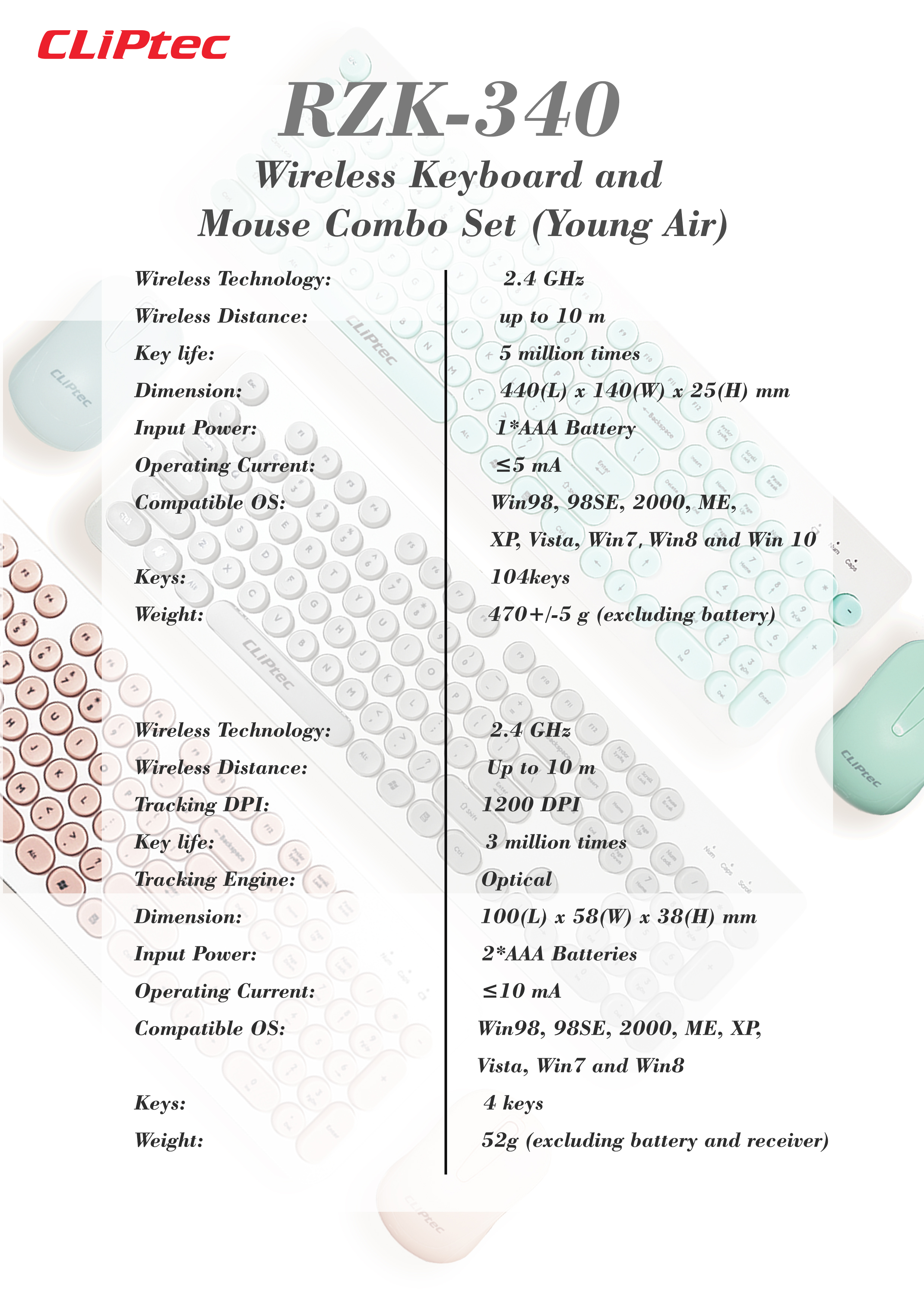 | Keys | 104+10 multimedia keys |