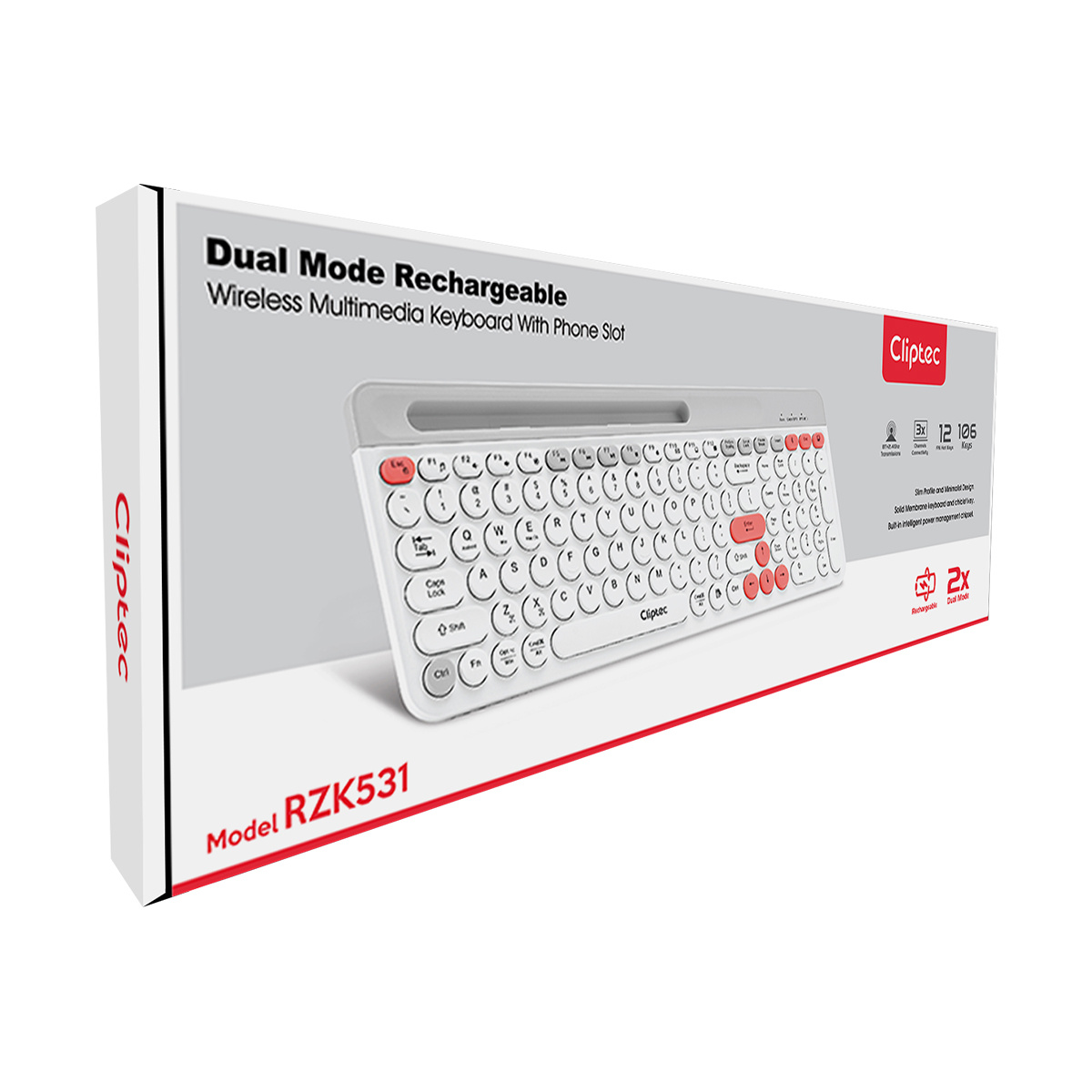 CLIPTEC RZK531 DUAL MODE RECHARGEABLE WIRELESS MULTIMEDIA KEYBOARD W PHONE SLOT (DUALCONN2) - WHITE