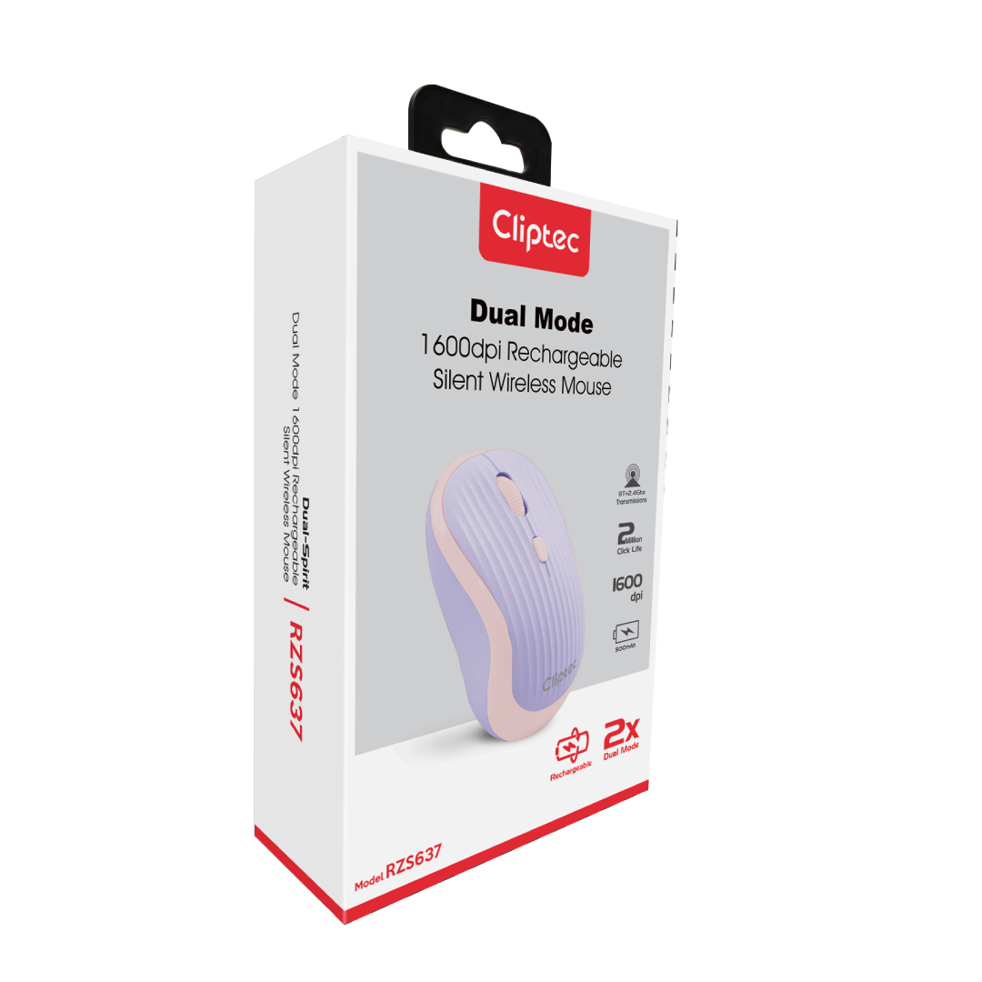 CLIPTEC RZS637 DUAL MODE 1600DPI RECHARGEABLE SILENT WIRELESS MOUSE (DUAL-SPIRIT) - LAVENDER PURPLE