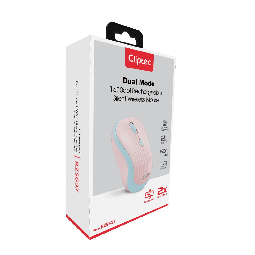 CLIPTEC RZS637 DUAL MODE 1600DPI RECHARGEABLE SILENT WIRELESS MOUSE (DUAL-SPIRIT) - ORCHID PINK