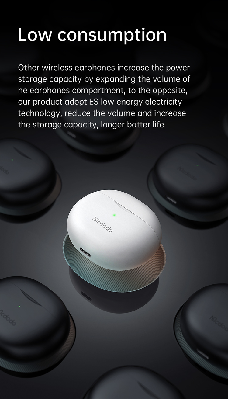 Other wireless earphones increase the power storage capacity by expanding the volume of the earphones compartment, to the opposite, our product adopt ES low energy electricity technology, reduce the volume and increase the storage capacity, longer battery life