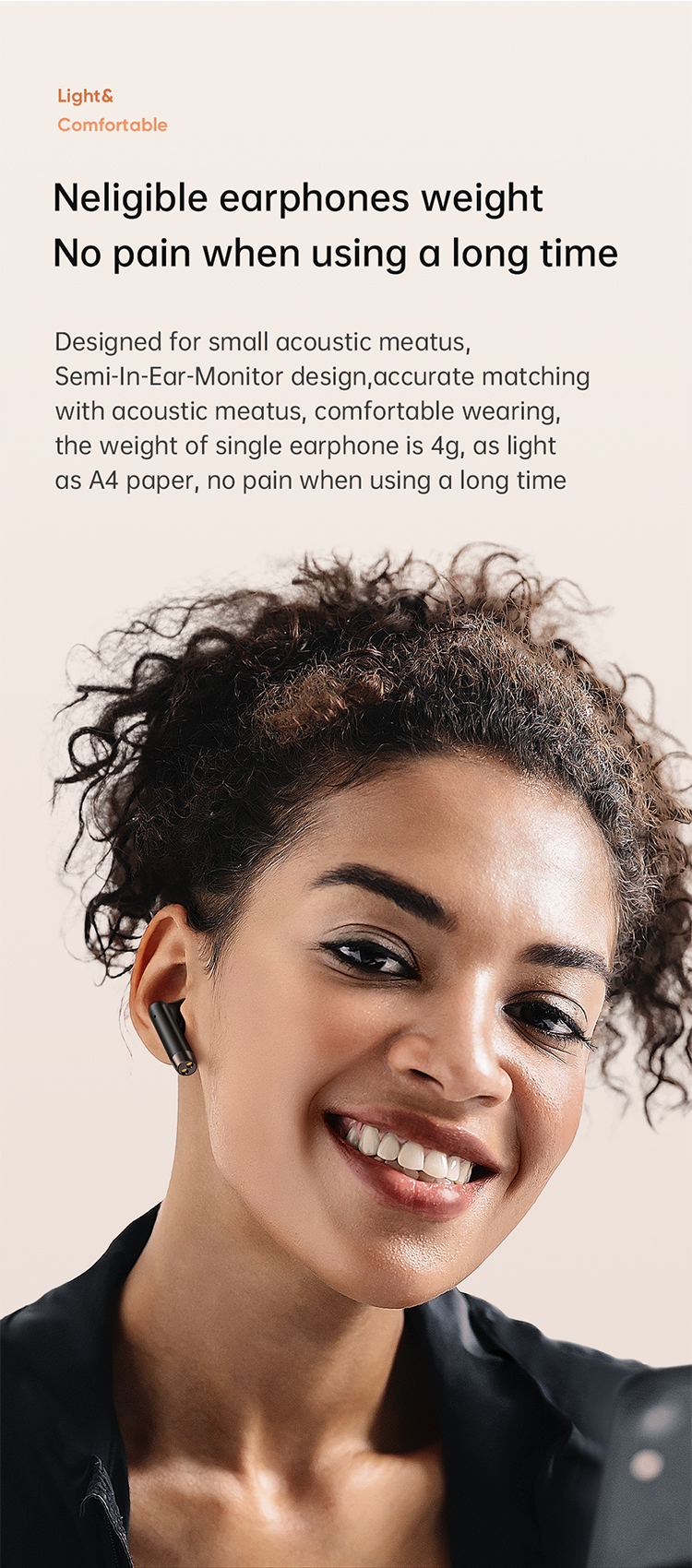 Designed for small acoustic meatus, semi in-ear monitor design, accurate matching with acoustic meatus, comfortable wearing, the weight of single earphone is 4g, as light as A4 paper, no pain when using a long time